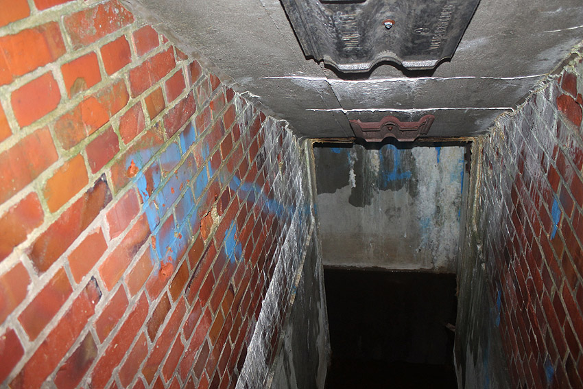 Es geht zunächst im Eingangsbau nach unten, dann nach links in die Schleuse, die mit zwei Türen gesichert war. Dahinter liegt nach rechts abgehend der Hauptraum, der sich komplett unter Erdgleiche befindet. Die Sitzgelegenheiten im Inneren waren im Gegensatz zu anderen Bauten dieser Art aus Stein gemauert. Heute steht das Objekt unter Wasser und dient seit etwa 2011 als Fledermausquartier.