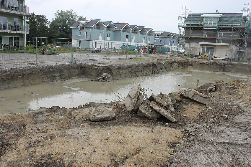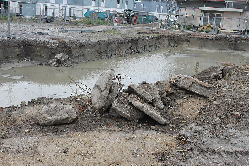 Die Betonstrukturen im Baustellenbereich sind größtenteils beseitigt worden. Weitere Strukturen als die ersichtlichen sind nicht mehr ans Tageslicht getreten. Nun erfolgt die Tiefgründung des Neubaues.