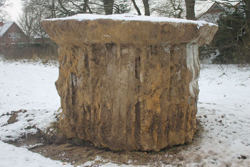 Nach einem halben Jahr Vorbereitung und Koordinierung sagen wir heute: "Ende gut, alles gut!" Der Tobrukstand als interessantes, martialisches Zeugnis des geplanten "Friesenwalls", in einem Friedeburger Erdloch für einen MG-Schützen Ende 1944 gegossen, wurde heute intakt nach Wilhelmshaven verbracht. Er steht nun als erster von fünf Kleinbunkern auf dem IEHF-Gelände am Kanalweg. Wir danken der Firma Hepag für den reibungslosen Transport, der Interessengemeinschaft zur Erhaltung historischer Fahrzeuge für den Stellplatz, der Firma JK-Fahrzeugtechnik für die Holzspende, dem WZ-Fotografen für die Ausdauer (wir hatten uns um ca. 30 min. mit der Ankunft verschätzt) und Herrn Wiard Remmers, der alles damals und bis jetzt durch seine Hilfe erst ins Rollen brachte.