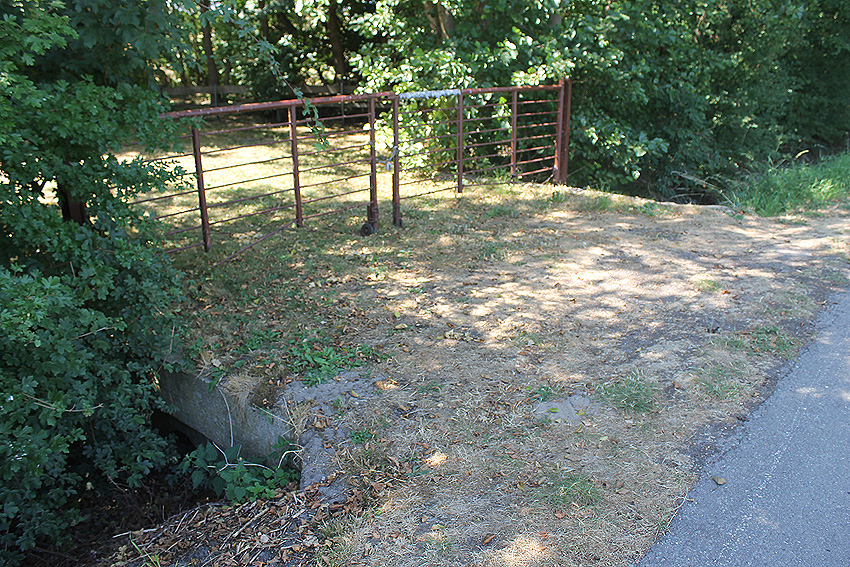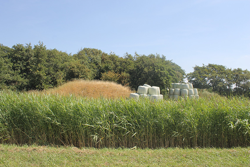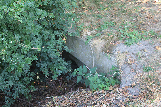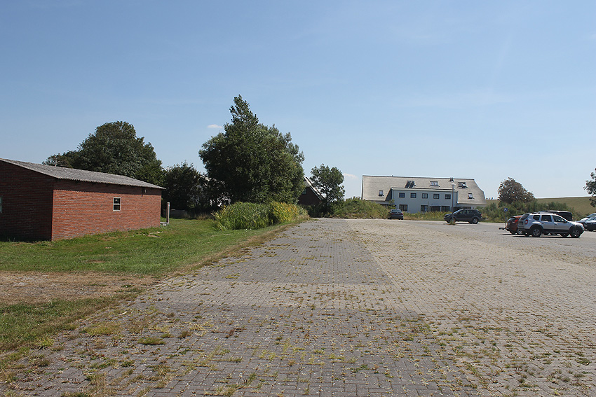 Hier zu sehen ist das ehemalige Gelände der Stabskompanie und des Flakuntergruppenkommandos (Ugruko) Ost Tossens. Es befand sich circa einen Kilometer nördlich der eigentlichen schweren Flakstellung. Bis heute erhalten blieb das ehemalige Wirtschaftsgebäude und ein Garagengebäude nördlich davon.