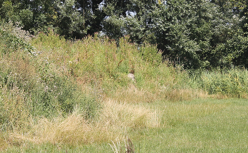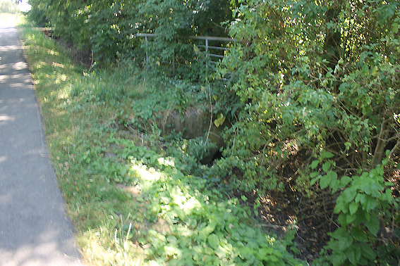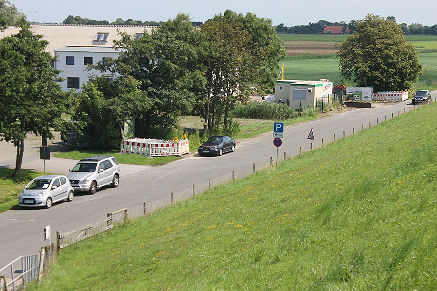 Oben: Hier auf dem Deich befand sich Scheinwerferstand 17 / Peters-Denkmal.