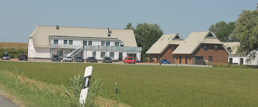 Oben: Rechts Süd-Teilbereich des ehemaligen Wirtschaftsgebäudes / inzwischen saniert und renoviert / das Restaurant auf dem Deich im Bereich Peters-Denkmal hat keinen historischen Zusammenhang mit der Flakstellung bzw. mit dem anliegenden Untergruppenkommando Ost.
