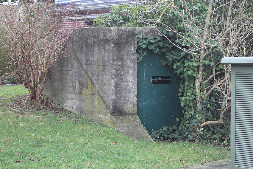 Der Splitterschutz-Überbau des Westeinganges ist mittlerweile nach vorne abgesackt / abgebrochen. Im nun offen liegenden Oberbereich wurde eine neue Fledermauseinflugs- ausflugsöffnung geschaffen. Möglicherweise ist der Überbau auch bewusst nach vorn gedrückt worden, um den Fledermäusen einen "besseren Einflug" zu gewährleisten.