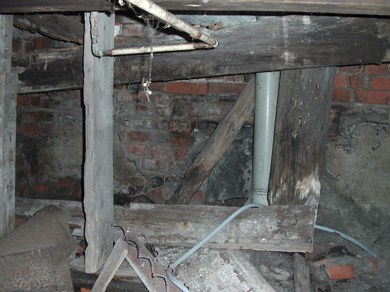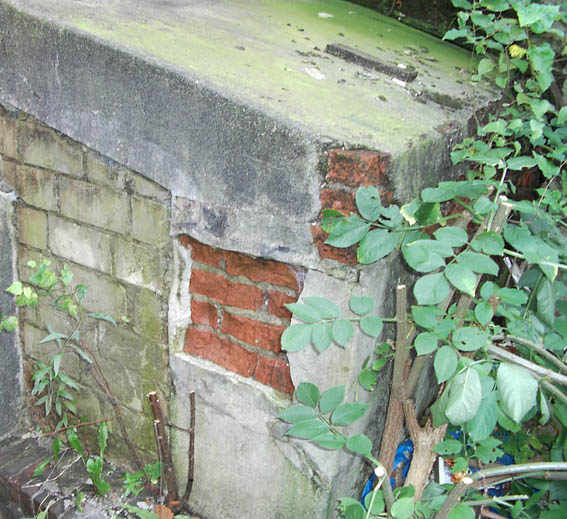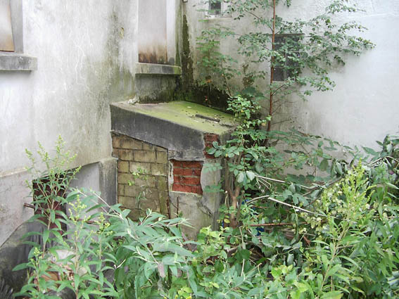 Der Bereich des Einganges / Notausstieges (Gasschleuse). Im Hintergrund ein weiterer Raum zum mutmaßlichen Erdbunker hin. Zu sehen sind nachträglich geschlossene Öffnungen im Mauerwerk. Dahinter könnte der Bunker sein.