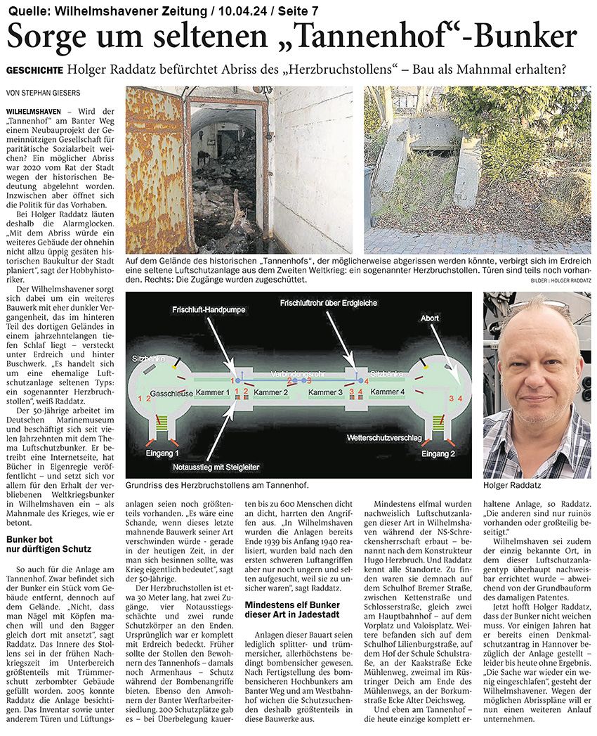 Frühjahr 2024: Mittlerweile ist das anliegende historische "Tannenhof"-Gebäude akut abrissgefährdet und auch der Herzbruchstollen ist damit gefährdet, weil er auf gleichem Gelände liegt. Ein Artikel dazu in der Wilhelmshavener Zeitung: