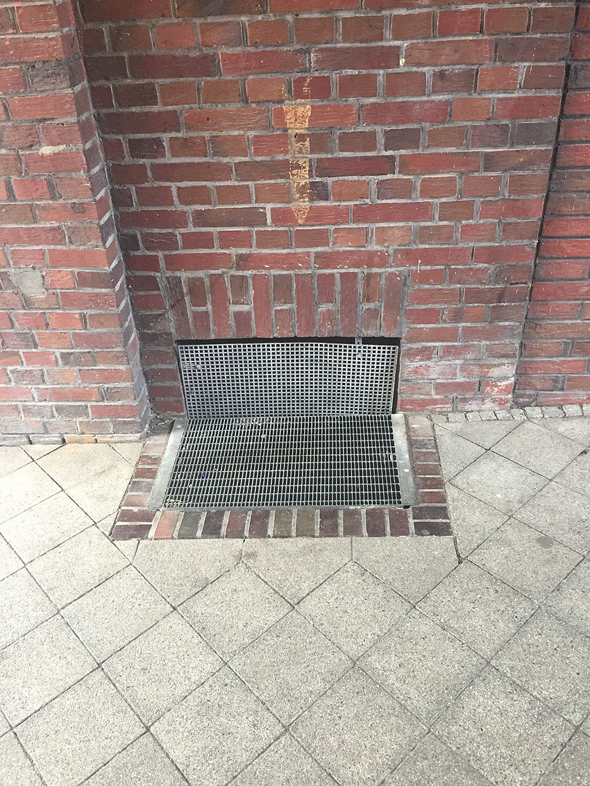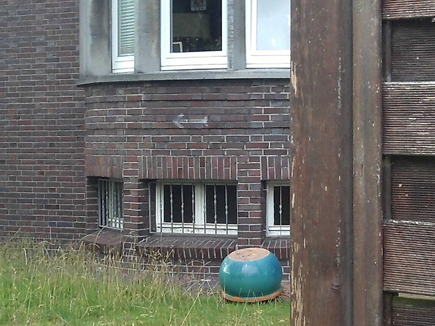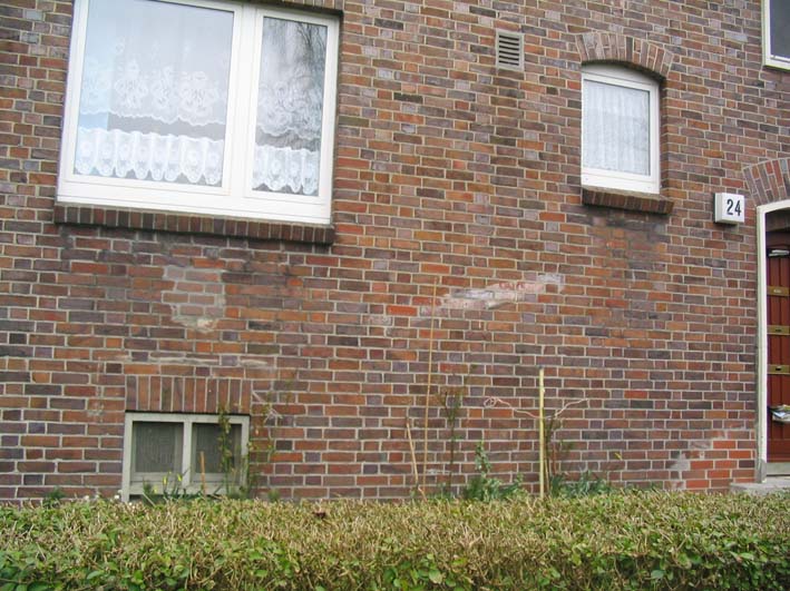 Vor vielen LS-Kellerfenstern im Stadtgebiet wurden Betonblöcke als Detonationsdruckschutz abgelagert. Der Zwischenraum zwischen Block und Außenwand wurde mit Putz abgedichtet.