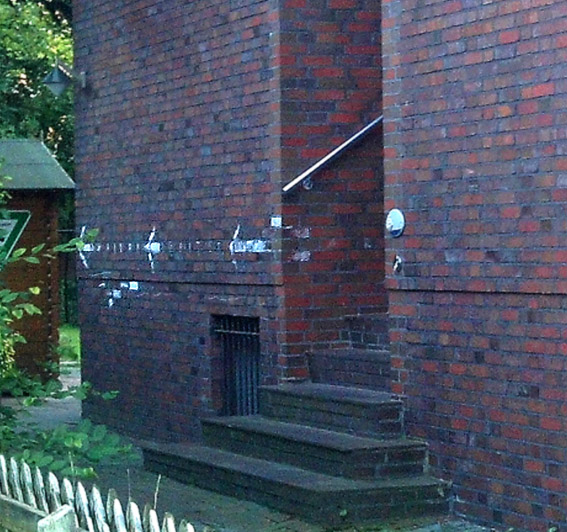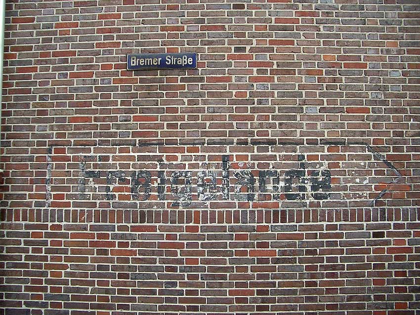 An der Wand des Gebäudes Bremer Straße 102 befindet sich dieser Hinweis mit Pfeil: