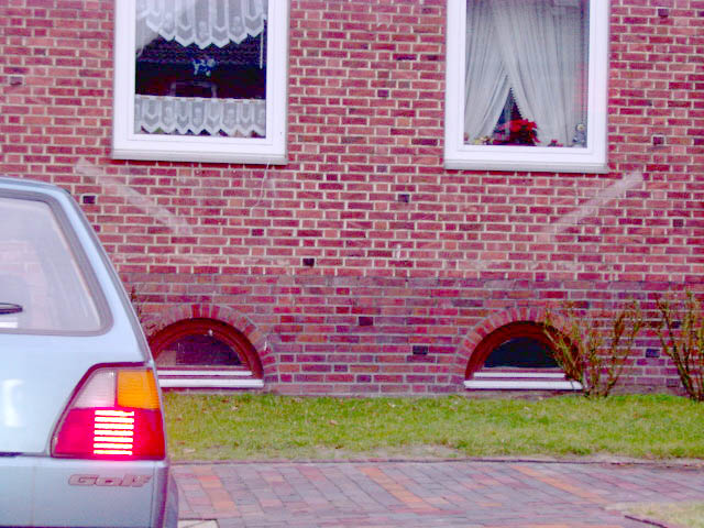 Es gibt auch Täuschungen. - Kein LS-Pfeil ist beispielsweise diese "Bemalung" am Mühlenweg 136 in Wilhelmshaven (unlogisch auch, da der "Pfeil" auf kein Kellerfenster zeigen würde...). Das Gebäude wurde erst nach 1945 errichtet...