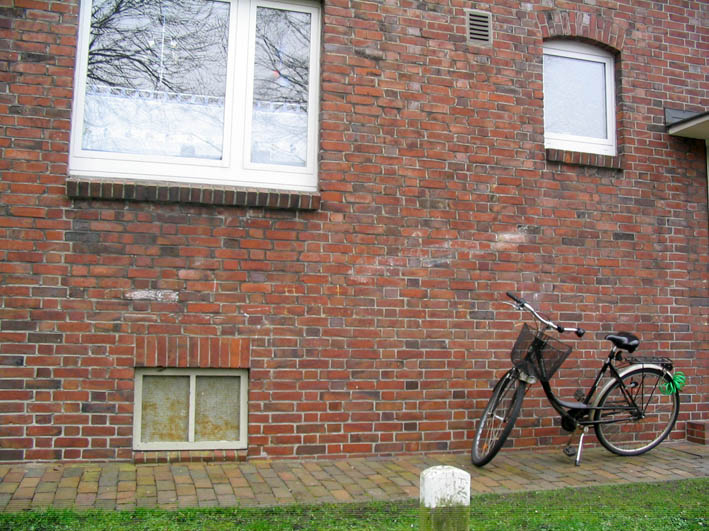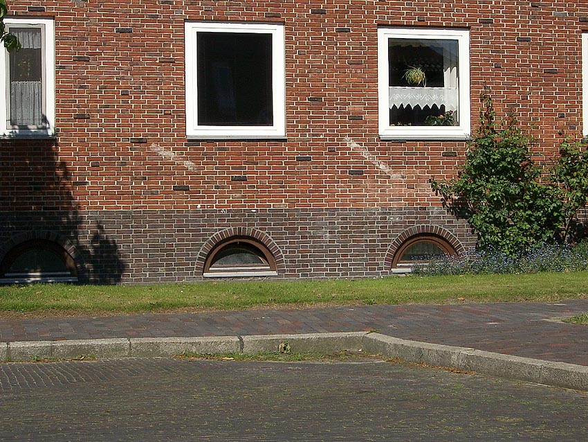 Wilhelmshaven / Kurpark / Bremer Straße 15 (im Hindenburgtor) / im Jahr 2023 erhalten (im Kellerfensterschacht dürfte sich im Krieg ein Mannesmann-LS-Gitter befunden haben / der geklinkerte Rand wird nach Ausbau des Gitters gefertigt worden sein)
